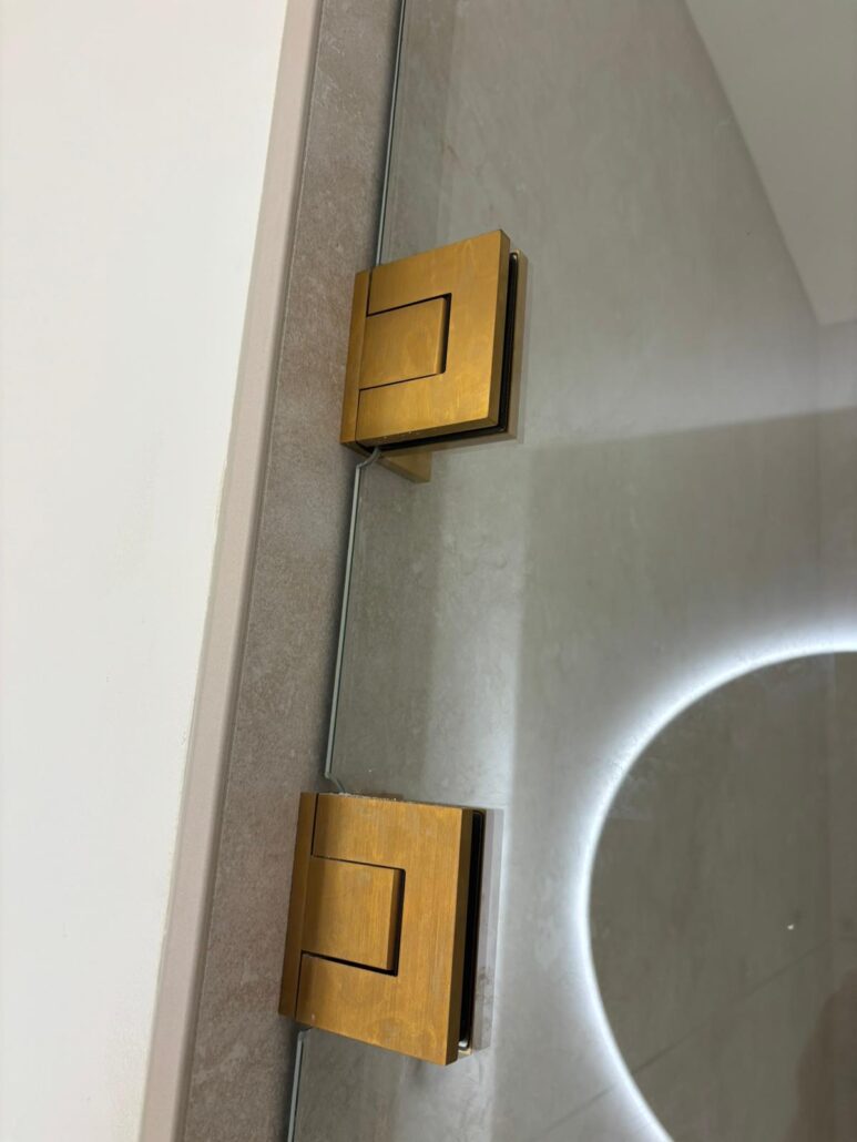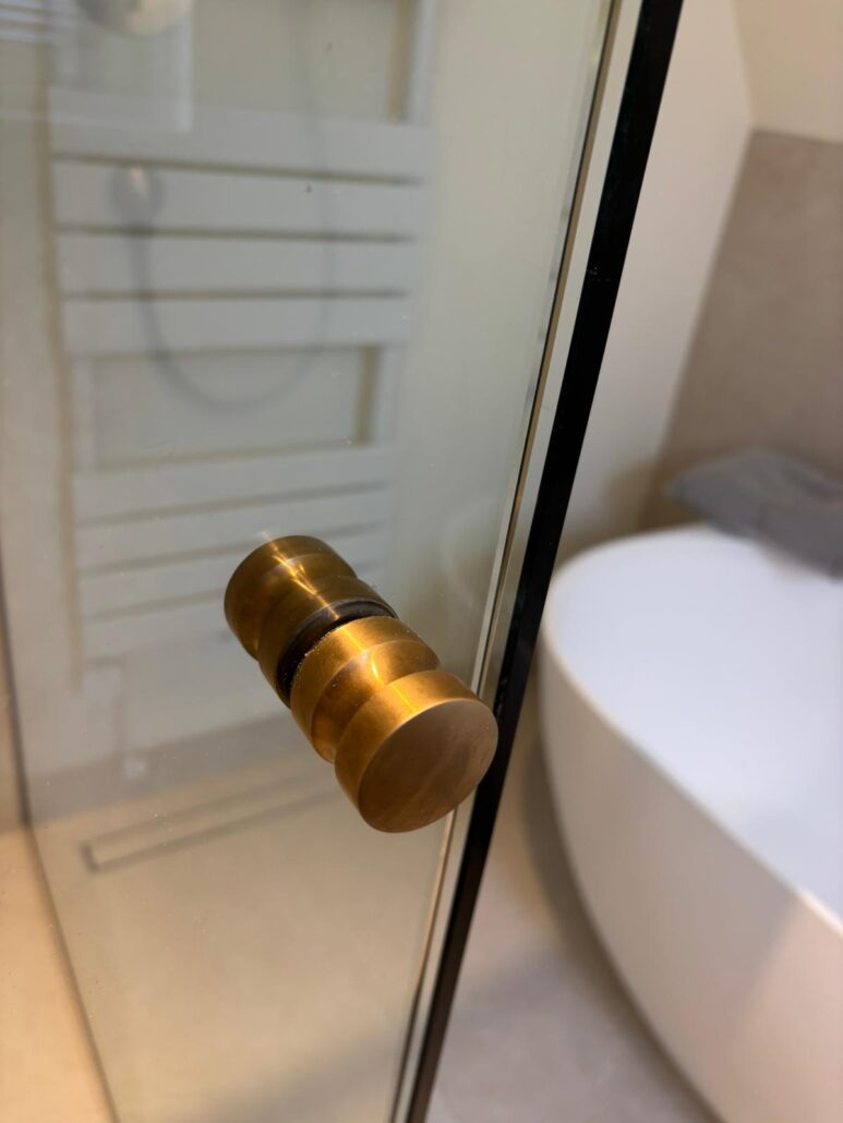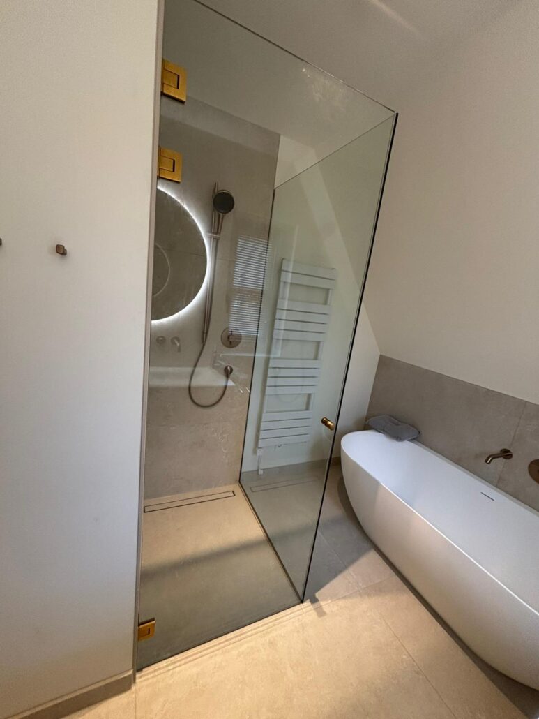 Hardglazen douchedeur en douchewand geïnstalleerd in badkamer in Enter